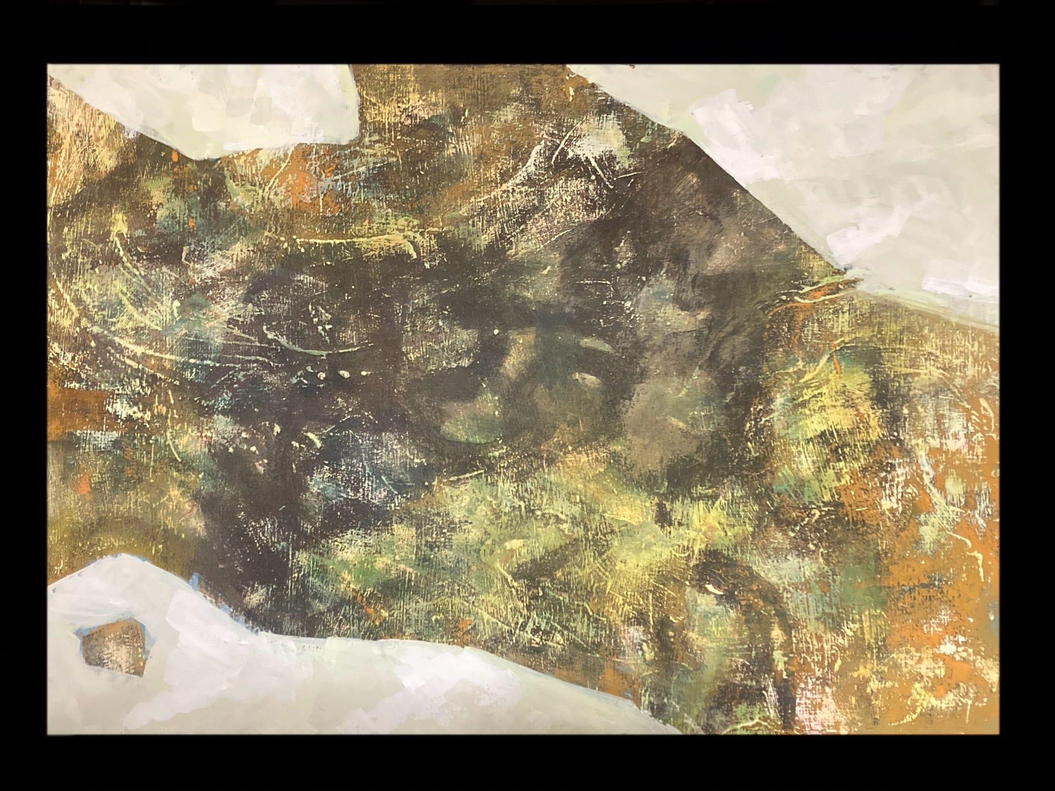 古い油絵の上に描いたら、浮き出た筆致が波紋のようで、水面に見える。